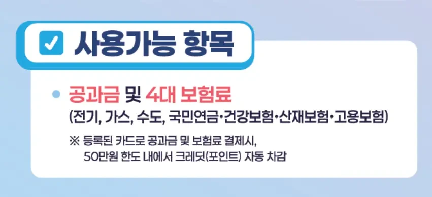 이 크레딧의 사용은 디지털 포인트 형태로 제공되며, 최대 50만 원까지 지원됩니다. 실제 결제 시, 선택한 카드사의 신용카드 또는 체크카드를 이용해 자동으로 차감되는 방식입니다. 예를 들어, 60만 원의 공과금을 결제할 경우 50만 원의 크레딧이 차감되고, 나머지 10만 원만 자부담하면 됩니다.