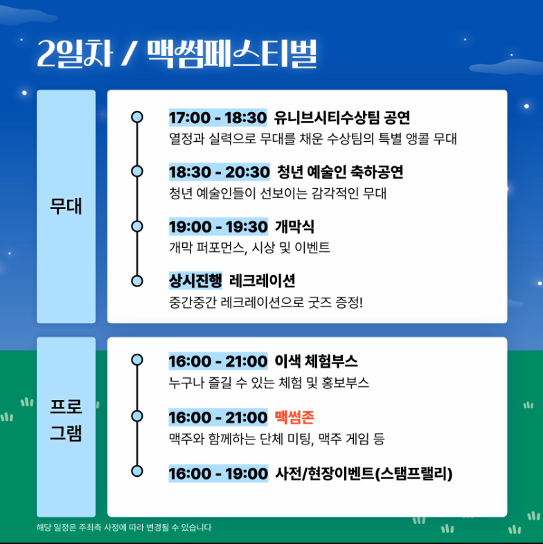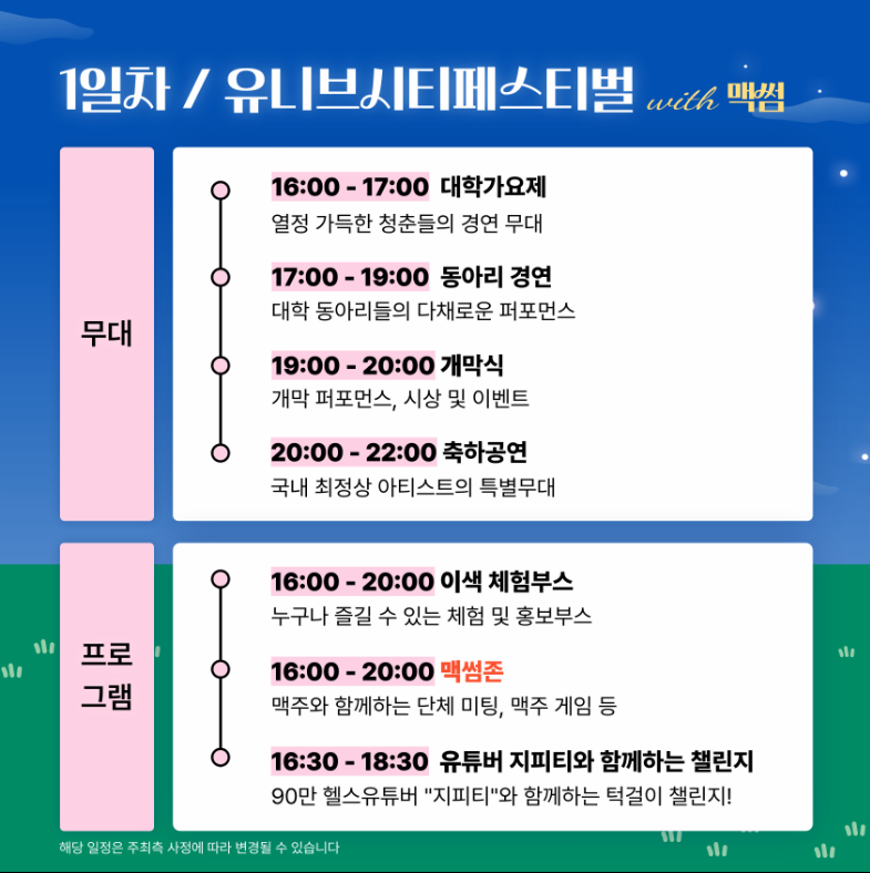 올해 유니브시티 페스티벌은 청년 맥주축제 '맥썸 페스티벌'과의 연계로 더 큰 시너지를 창출하였습니다. 축제 기간 동안 다양한 프로그램이 성공적으로 운영되며 참석객들의 큰 호응을 얻었습니다. 축제는 대학가요제, 동아리 공연, 그리고 학과 및 동아리 홍보부스와 같은 구성으로 풍성하게 이루어졌습니다.