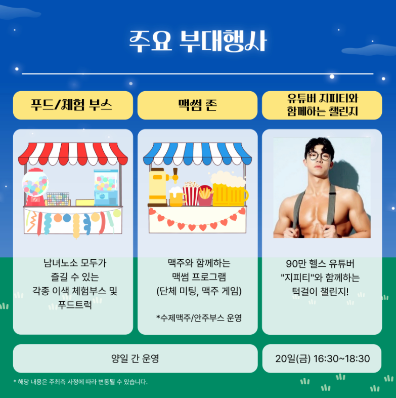 축제의 또 다른 매력은 체험 행사와 미니게임존입니다. 다양한 체험 프로그램을 통해 참가자들은 직접 만들어 보는 즐거움을 느끼며, 가족 단위 방문객들도 함께할 수 있는 다양한 게임과 부스가 마련되어 있습니다. 특히, '썸남썸녀' 개념의 맥썸존은 친구들과 함께 소중한 시간을 보내는 데 최적의 장소가 될 것입니다.