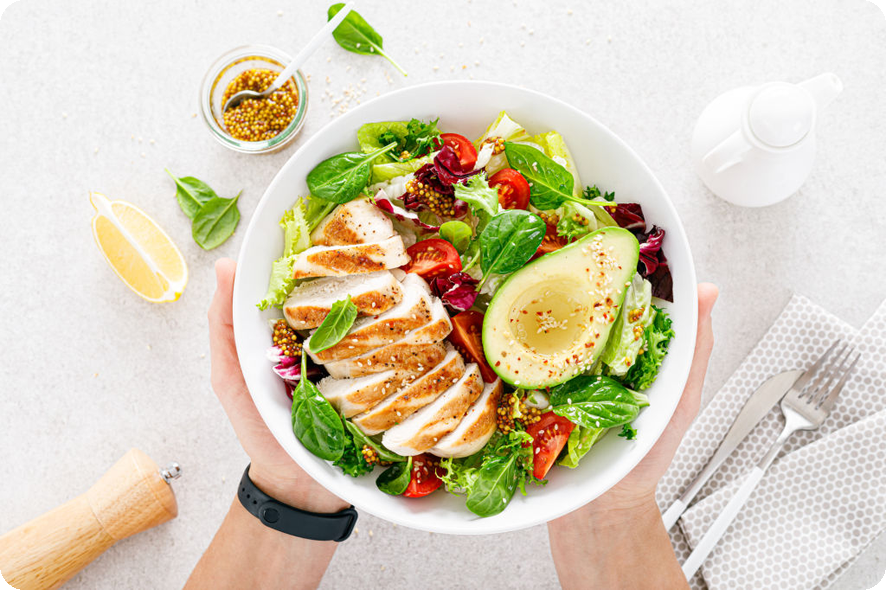 - 닭가슴살 샐러드: 퀴노아, 시금치, 아몬드, 그리고 발사믹 드레싱을 곁들인 샐러드.