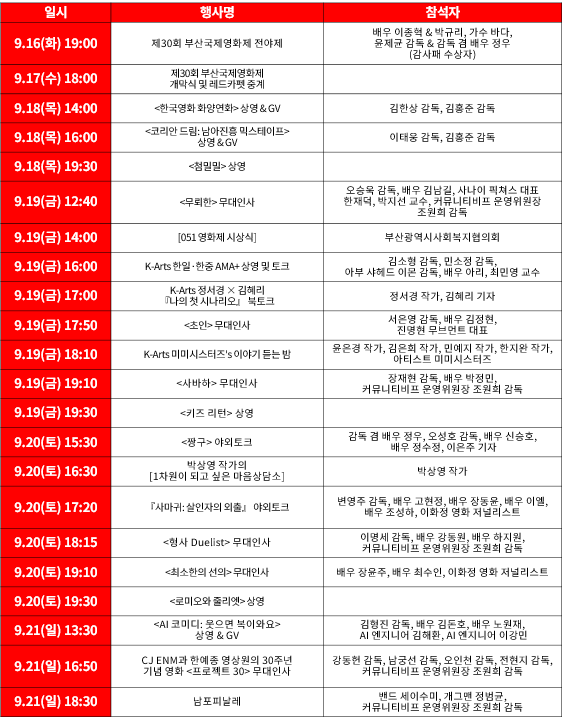 부산국제영화제의 야외 무대 인사는 관객과 감독, 배우들이 직접 대면하여 소통할 수 있는 소중한 시간입니다. 아래 표는 2025년도 야외 무대 인사 일정을 정리한 것입니다.